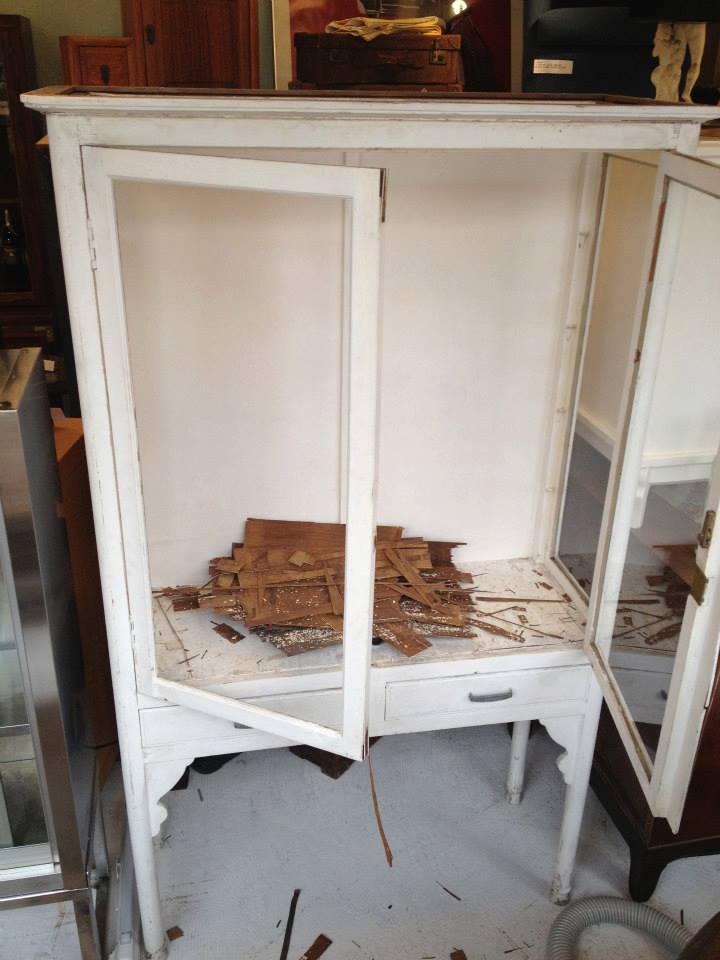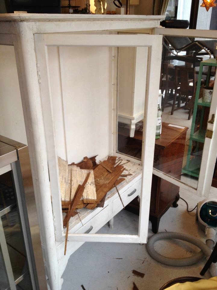 だいぶ使い込んでいるキャビネットが入荷しました。ガラス破損、立付け悪し、天板が水濡れで波打ってている、という状態です。しかし良い感じのペンキのフレームは、とてもしっかりしているのでこれを再生していきますー